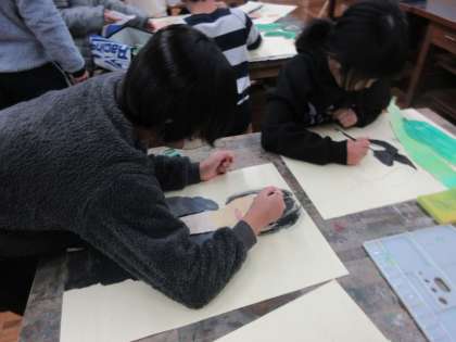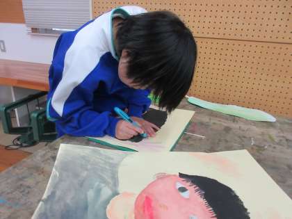 図画工作科「ヘチマとぼく・私」(4年生) 公開日 2023/11/30 更新日 2023/11/30 4年生 図画工作科の学習で、ヘチマと自分の顔の絵を描きました。自分の顔を鏡でよく見て、陰影を気にしながら塗っていました。