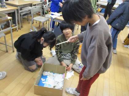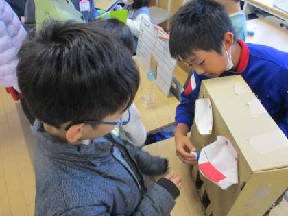4年生のエコアイランドに参加(3年生) 公開日 2023/12/06 更新日 2023/12/06 3年生 4年生が総合的な学習の時間に取り組んでいる「エコアイランド」に招待してもらいました。普段捨ててしまうようなものを使って楽しい遊びを考えていました。3年生も楽しく遊ばせてもらいました。