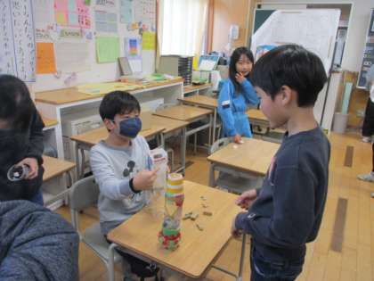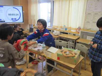 総合的な学習の時間に「エコアイランド」を開催し、3年生を招待しました。招待した下級生から「ごみになるものがこんなに楽しい遊び道具になるなんてびっくりした」と感想をもらい、エコのよさが伝わったと喜んでいました。