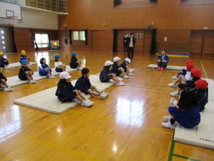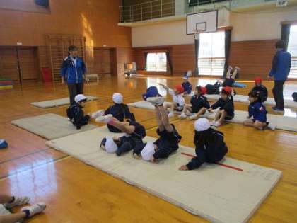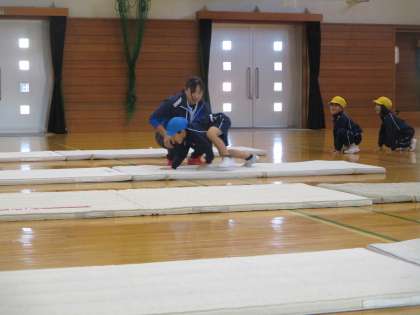 スポーツ指導員派遣事業(1年生) 公開日 2023/12/08 更新日 2023/12/08 1年生 スポーツ指導員の方に前転や後転の仕方を教わりました。最初は不安を感じていた子供も、クマ歩きやゆりかご等のマット遊びを通して、楽しく取り組むことができました。
