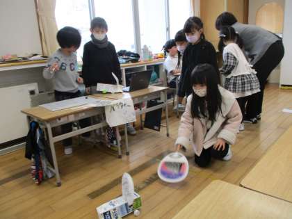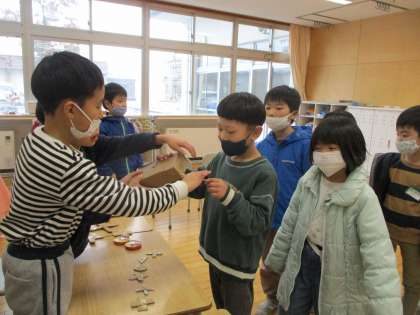 2年生の生活科「みんなで楽しいおもちゃランド」に招待していただきました。2年生がつくったおもちゃで楽しく遊び、素敵な景品をもらって楽しみました。お礼の手紙を渡し、感謝の気持ちを伝えました。