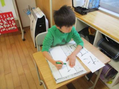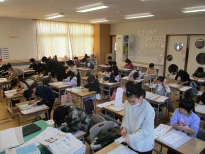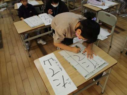 登校してから、子供たちはとても賑やかで、友達と会えて楽しそうにしていましたが、校内書初大会が始まると、集中した雰囲気に変わりました。よい姿勢で、最後まで取り組んでいました。