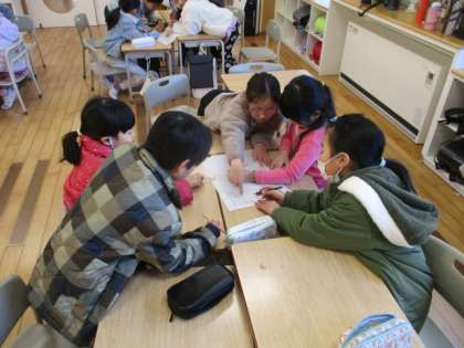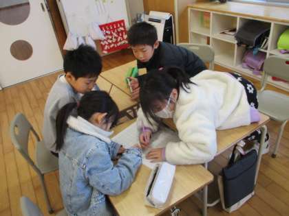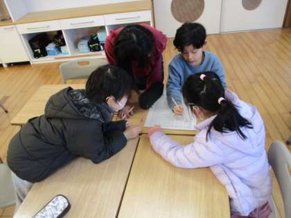 算数科では、「4けたの数」の学習をしています。丸は全部で何個あるのか、班で数えました。100のまとまりや、1000のまとまりを意識して数を数えていました。