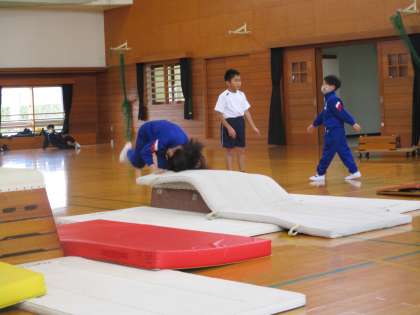 体育科の学習(3年生) 公開日 2024/01/29 更新日 2024/01/29 3年生 跳び箱運動の学習では開脚跳びや台上前転を、踏切から着地までの一連の動作を美しく見せようと練習しています。得意な子は、抱え込み跳びや仰向け跳びにも挑戦しています。