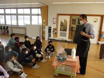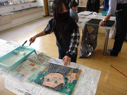 今日は、版画を刷りました。一生懸命水彩で塗った色が黒い紙に写り、喜んでいる姿が見られました。
