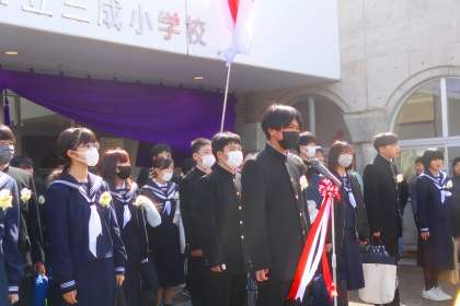 門出の式 1 公開日 2024/03/18 更新日 2024/03/18 三成っ子 卒業生と在校生の代表が前に出て、お互いにエールを交換しました。卒業生が巣立っていく時には、在校生も卒業生も笑顔でお別れをしていました。