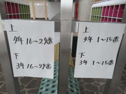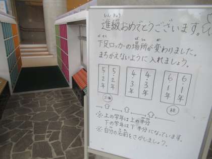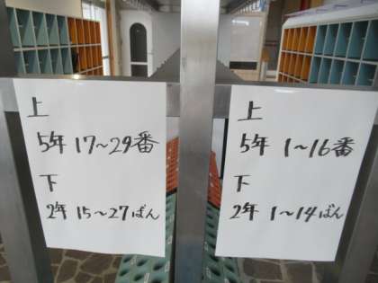 新学期の準備が急ピッチで進んでいます・・・ 児童玄関の表示を確認して、自分の下足箱を見付けてくださいね!