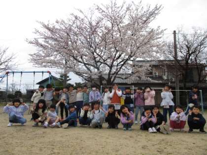 2年生全員が元気に登校しました。グラウンドに咲く桜の前で集合写真を撮りました。