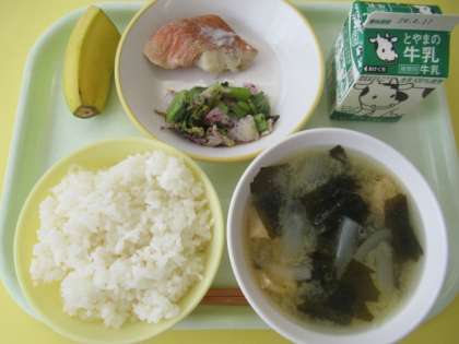 10日(水)今日の献立 公開日 2024/04/10 更新日 2024/04/10 給食室 ・ごはん ・牛乳 ・赤魚の塩焼き ・ゆかり和え ・みそ汁 ・バナナ ※11時40分、検食終了。 デザート付きなのが、うれしいですね。 1〜3年生の「赤魚の塩焼き」は、少し小さいサイズになっています。