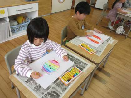 図画工作科「あったらいいな こんなおひさま」で、一人一人が自分の好きなお日様を画用紙いっぱいに描きました。笑っているお日様や、好きな物を食べているお日様など、どれもアイディアが詰まった素敵なお日様に仕上がりました。