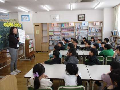 図書室オリエンテーション(1年生) 公開日 2024/04/19 更新日 2024/04/20 1年生 図書室の司書の先生に、図書室の使い方を教えてもらいました。最初に、絵本の読み聞かせがあり、目を輝かせながら見入っていました。その後、初めて本の貸し出しを体験しました。「借ります。お願いします。」「ありがとうございました。」のあいさつがしっかりできました。これからたくさんの本に触れてほしいと思います。