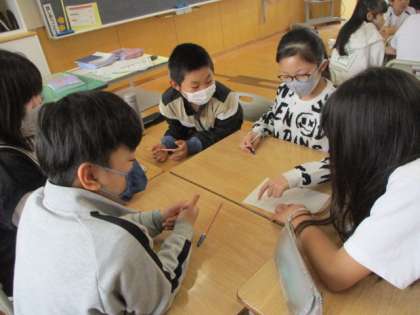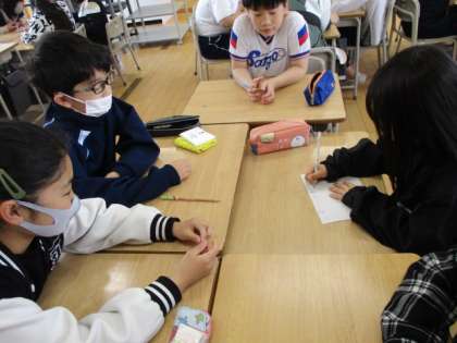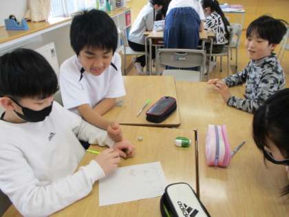 絵しりとりで協力(5年) 公開日 2024/04/20 更新日 2024/04/20 5年生 今年度最初の席替えをしました。アイスブレイクとして、グループで絵しりとりをしました。「わかった!」「次、描くよ!」「あーなるほどね!」など、楽しむ声がたくさん聞こえました。