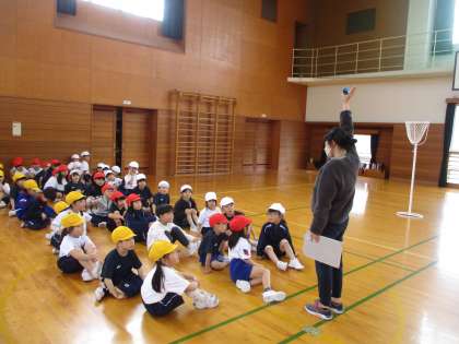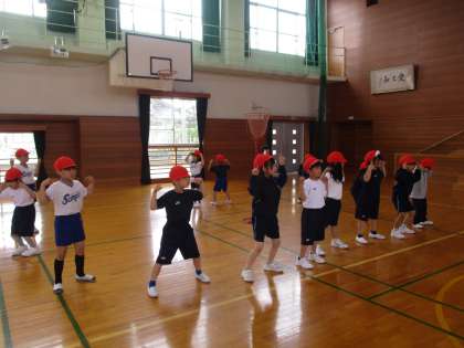運動会で1・2年生は玉入れをします。先生と目をつないでお話を聞いたり、ダンスの練習をしたりしています。