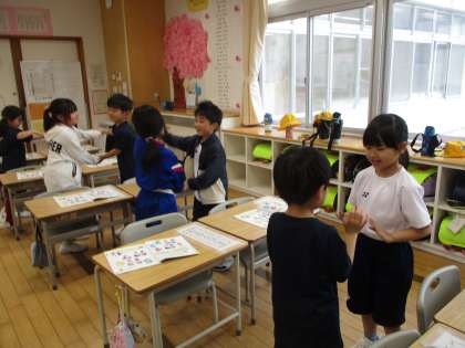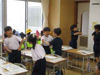 音楽の時間に、ペアになり、曲に合わせて振り付けを考えました。手をパチンと合わせたり、一緒にジャンプしたりするなど、友達と考えた振り付けで楽しく踊りました。