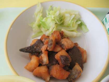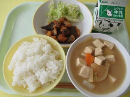 26日(金)今日の献立 公開日 2024/04/26 更新日 2024/04/26 給食室 ・ごはん ・牛乳 ・ゆでキャベツ ・魚とレバーの揚げからめ ・ごまけんちん ※11時45分、検食終了。 「けんちん汁」は、大根やにんじんなどの野菜を油で炒めてから煮込む料理ですね。今日は「ごま」もたっぷり。 【調べよう!三成っ子】 「けんちん汁」って、どんな料理? 作り方は? 「けんちん汁」は、どこの料理? 国は? 県は?