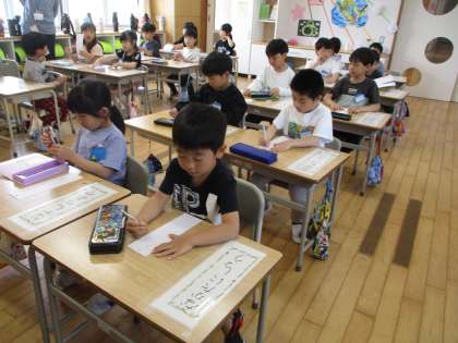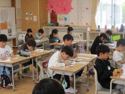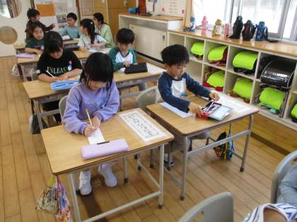 日直当番の名札を作りました。自分の名前を丁寧に書いた後、字の周りに自分の好きな模様やキャラクターなどを描きました。とても素敵な名札ができました。