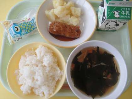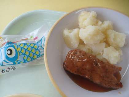 30日(火)今日の献立 公開日 2024/04/30 更新日 2024/04/30 給食室 ・ごはん ・牛乳 ・こふきいも ・鯉のぼりハンバーグ ・若竹汁 ・かしわもち ※11時50分、検食終了。 今日のメニューは、「こどもの日こんだて」です。鯉の形をしたハンバーグやかわしわもちなど、うれしいですね。新ワカメとタケノコのすまし汁の「若竹汁」も美味しいです。