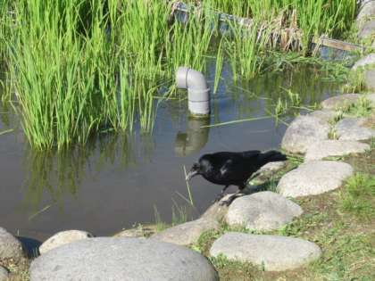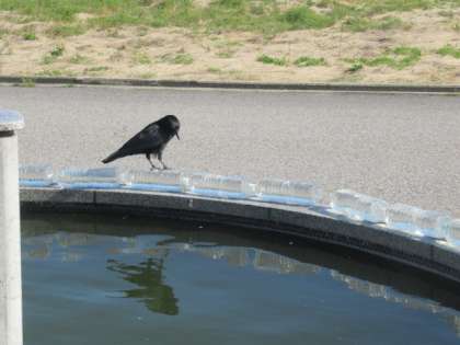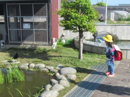 池に近づくカラス・・・追い払おうとする三成っ子! でも、怖くて? 近づけない・・・