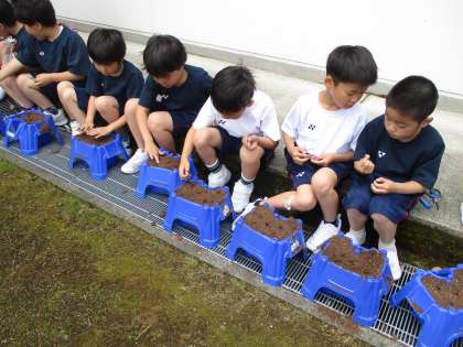 先日、じっくり観察した種を一つ一つ土に穴を開けて、とても大事そうに植えました。