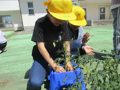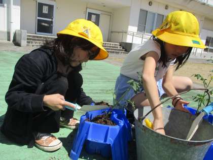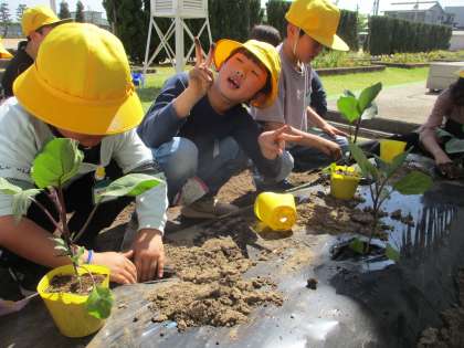 野菜の苗を植えました。ミニトマトは自分の鉢に、トウモロコシや枝豆など、みんなで決めた野菜は三成っ子農園に植えました。大きくなるように大切に育てたいと願う子供たちです。