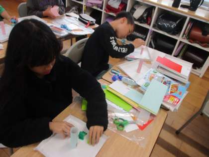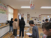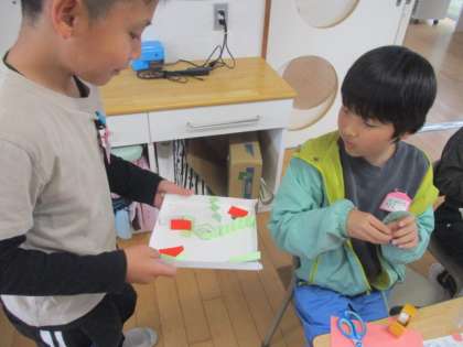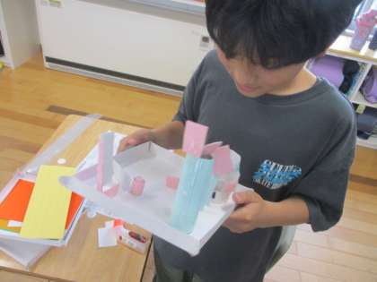 コロコロガーレを作成中です。ビー玉の通り道を工夫しています。 楽しそう・・・