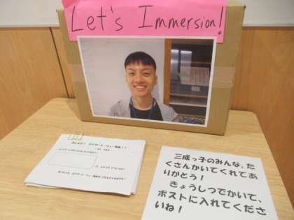 英語をイマージョン 公開日 2024/05/22 更新日 2024/05/22 3年生 今日は、エド先生の来校日・・・ いつの間にか、エド先生への「クエスション・ポスト」(?)が設置されていました。 中には、すでに・・・メニー・クエスションズ! ワォ! どんな英語表現が飛び交うか、楽しみです! たくさん覚えたいです・・・