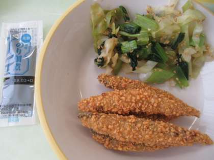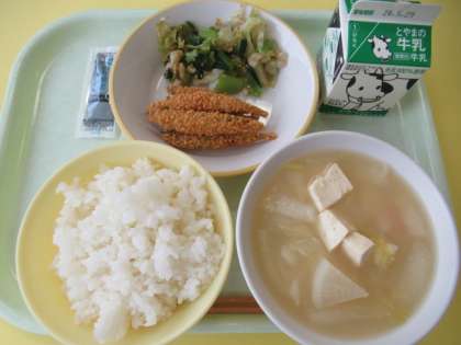 「きびなごのさくさく揚げ」のキビナゴは、主に西日本でとれる、体調10cm程の魚です。また、「呉汁」は、水に浸してすりつぶした大豆が入った味噌汁ですね。