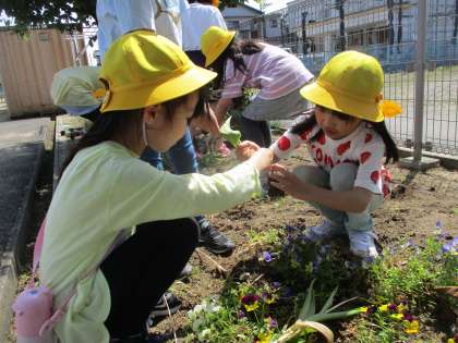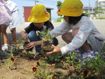 三成小学校の花壇に新しい苗を植えるために、花壇の整備をしました。みんなで協力して綺麗にすることができました。