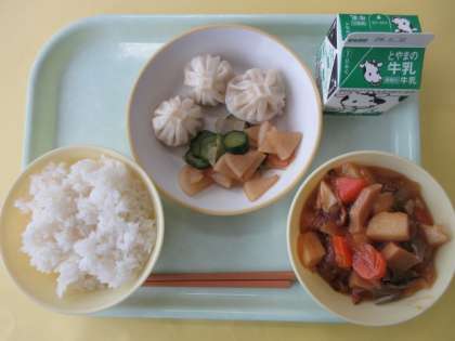 ・ご飯 ・牛乳 ・えび包子 ・華風和え ・酢豚 ※11時55分、検食終了。