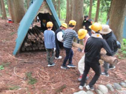 森小屋の床部分をつくっています。 丸太を運び、荒縄で木に縛り付けます・・・