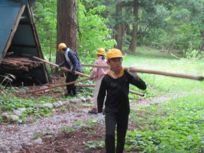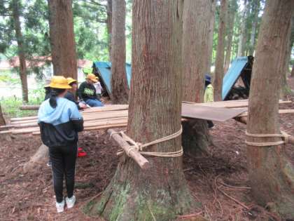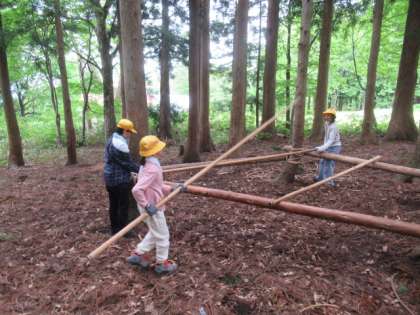 次は、丸太の上に竹をのせていきます・・・ 最後に、竹の上に板をのせます・・・