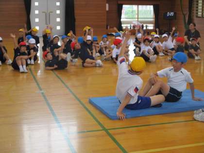 6年生に教えてもらいながら、上体起こしや反復横跳びを行いました。