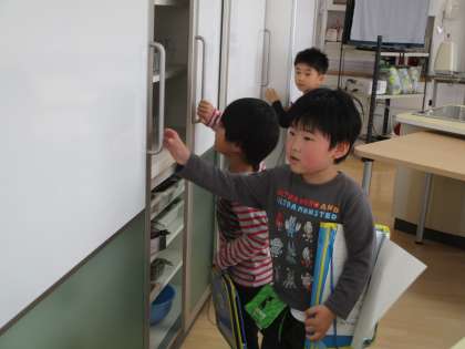 1年生は、前回の探検の振り返りから、もう一度学校探検に行くことにしました。今日は、保健室の扉の中や、冷蔵庫の中を見せてもらったり、校長室に飾ってある歴代の校長先生の写真のことを質問したりしていました。