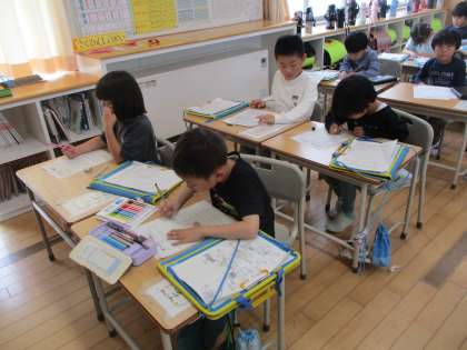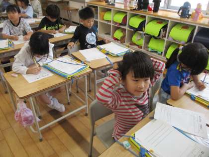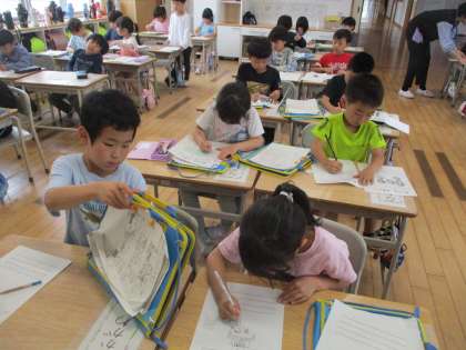 探検から戻った子供たちは、発見カードに見つけたことや見つけたものを書きました。2回目の探検では、さらに学校のことをたくさん知ることができて、とても楽しかったようです。