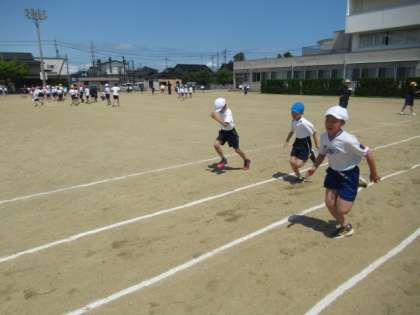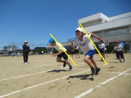 50mを全力疾走! 違う学年の人とも、競争だぁ スタートの前傾姿勢がきまっています!