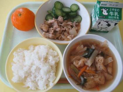 11日(火)今日の献立 公開日 2024/06/11 更新日 2024/06/11 給食室 ・ごはん ・牛乳 ・豚肉のジャンロー ・きゅうりもみ ・沢煮椀 ・冷凍みかん ※11時45分、検食終了。 今日は「冷凍みかん」がデザートに付いています。廊下を通っていると「今日のデザートは、冷凍みかんだよ」と教えてくれる子がたくさんいました。今日は暑いので(真夏日)?「冷凍みかん」を楽しみにしていることが、ひしひしと伝わってきました!