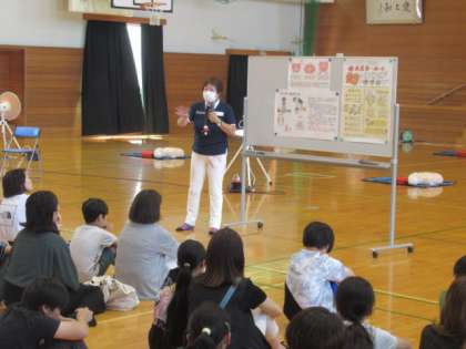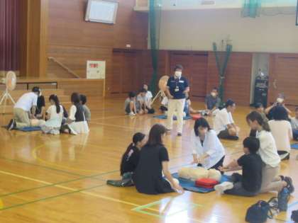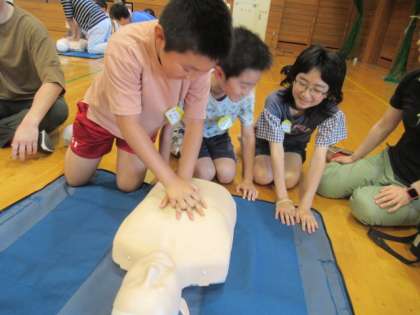AEDの使い方も学びました。 プール当番をしていただく保護者向けでしたが、ちょっとやっていました・・・