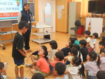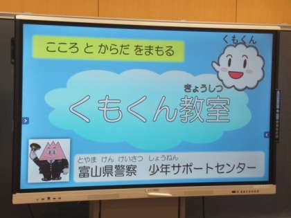 1年生 くもくん教室 公開日 2024/07/01 更新日 2024/07/01 1年生 県警・少年サポートセンターの方による「くもくん教室」を実施しました。 「プライベートゾーン(水着でかくれるところ)」と「口(くち)」は、人に見られたりさわらせたりしては、いけまん!」ということを教えていただきました。