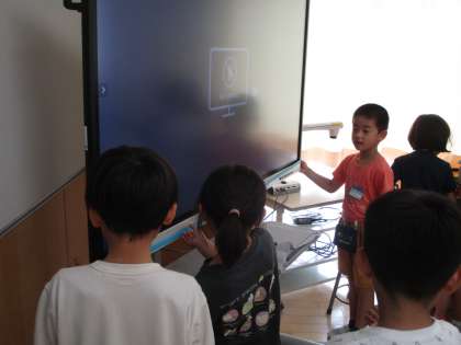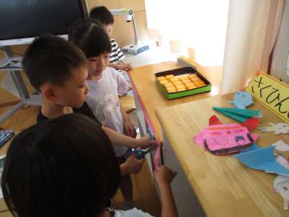 1年生は、「どちらがながい」の学習で、色紙テープを使って教室の黒板や机の長さ等をグループに分かれて測りました。みんなで協力していろいろな物の長さを測って比べました。