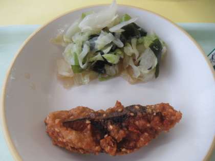 「魚の利久揚げ」に使われているのは「くふらぎ」です。1・2年生の魚は、少し小さめです。「利久(利休)揚げ」は、「ごま」を使った揚げ物で、千利休(約500年前の茶人)にちなんでいるそうです。