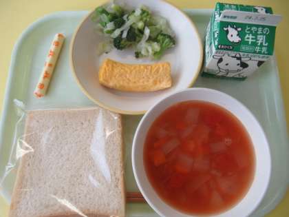 18日(木)今日の献立 公開日 2024/07/18 更新日 2024/07/18 給食室 ・食パン ・牛乳 ・フレンチサラダ ・卵ロール ・ミネストローネ ・棒チーズ ※11時40分、検食終了。 毎週木曜日は「パン食」の日で、今日は「洋食風献立」ですね。「ミネストローネ」は、イタリア語で「具だくさん、ごちゃまぜ」という意味だそうです。写真(3枚目)では分かりにくいですが、タマネギ、ニンジン、トマト、ウインナー、白インゲン豆などが入っています。