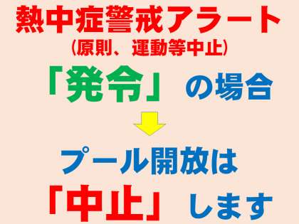 熱中症警戒アラートが、前日17時「発令」→当日5時「発令なし」、逆に、前日17時「発令なし」→当日5時「発令」ということもあることから、プール開放「実施/中止」決定について、次のように変更させていただきます。
