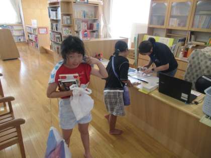図書室開放(1日目) 公開日 2024/08/05 更新日 2024/08/05 3年生 プール開放の前や後に、10名程の子供たちが本を借りていました。 夏休み中は、「特別に“3冊まで”借りることができる」と、うれしそうでした。