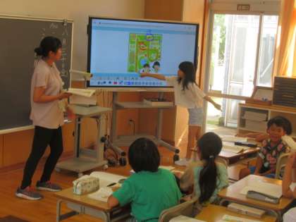 「ことばで みちあんない」の学習・・・ 教科書の文章が説明している場所や動きを絵地図で確かめています。