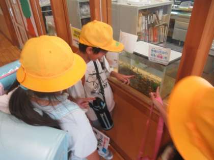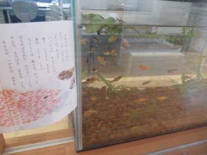 職員室の水槽(地域の方からいただいた金魚(和金)を見て)