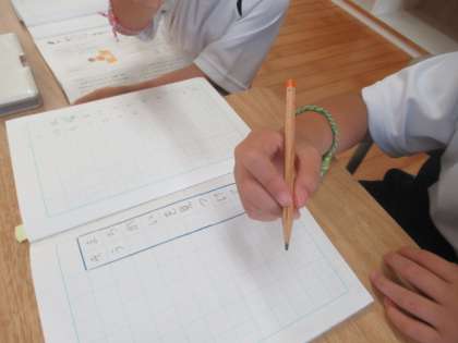3本の指先で鉛筆をはさんで・・・ C「〇〇(ゴム製の何か)を持っているから大丈夫だよ」