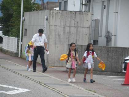 11日(水)登校の様子 公開日 2024/09/11 更新日 2024/09/11 1年生 雨雲? 曇っていて、涼しい朝です・・・ T「おはよう! 元気?」 C「うーん・・・?」 元気のない1年生を、見守りながら登校してくれました。
