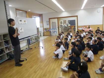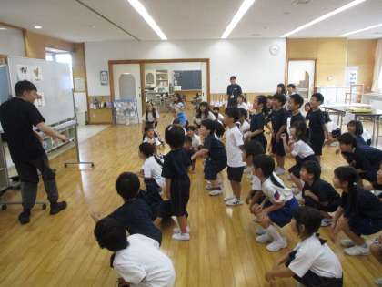 1,2年集会 公開日 2024/09/11 更新日 2024/09/11 1年生 今日の朝の活動タイムに、1,2年生はワークスペースに集まって集会をしました。イマージョンALTのエド先生と動物ゲームをしました。みんなは、エド先生に続いて英語で発音したり、ゲームを楽しんだりしました。
