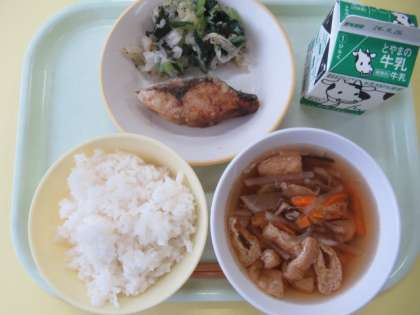 今日も美味しく出来上がっています。「沢煮椀」(3枚目の写真)は、愛知県の郷土料理だそうです。「魚のかば焼き」(2枚目の写真)に使われている魚は「フクラギ」です。1・2年生の魚は、少し小さめです。