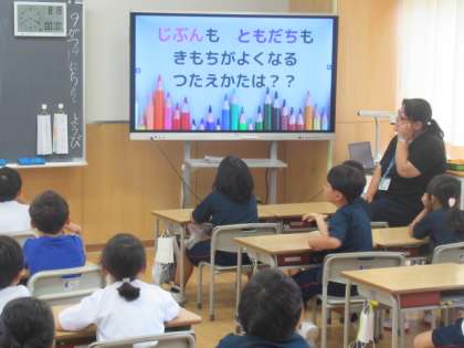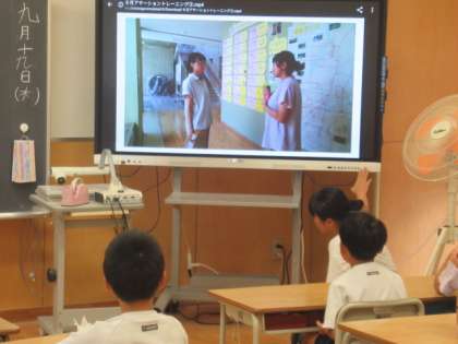 全校 自分の気持ちの伝え方 公開日 2024/09/19 更新日 2024/09/19 1年生 朝活動で、3つの伝え方「いばりんぼうパターン」「しぶしぶパターン」「ぽかぽかパターン」のビデオを見て、考えたり、やってみたりしました。